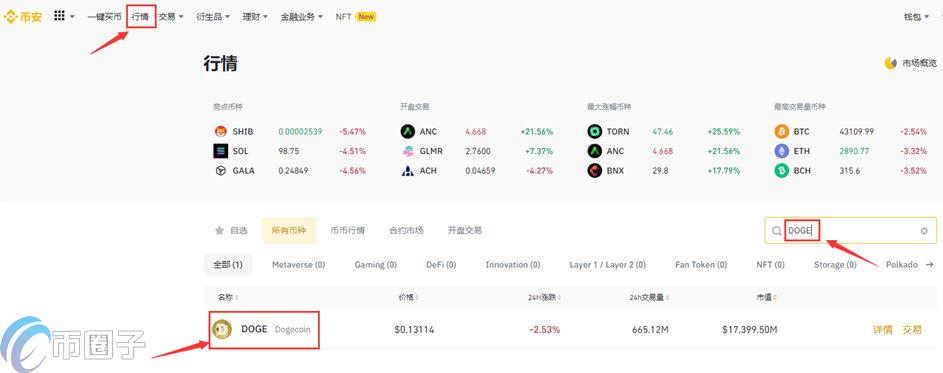 5、点击行情进入币种页面,搜索狗狗币英文简称DOGE。