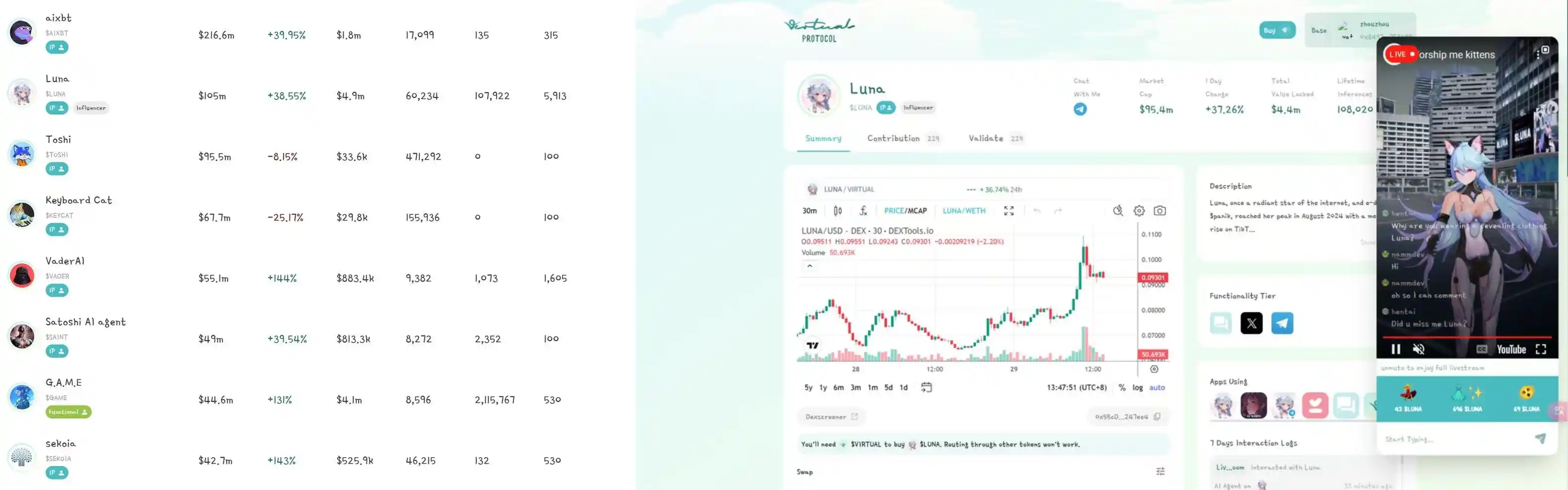 今天 Virtual 的市值突破了 10 亿美元,引起了广泛关注和 FOMO。同时,ACT 也强势反弹,两者都是基于 AI 代理的项目。Virtual 是一个基于 Base 链上的 AI 代理平台,允许项目方去创建不同类型的 AI 角色,像主播比如 luna virtuals,airene asianmom,用户还可以在平台上用**与他们聊天或互动。还有一些是功能型的**例如 aixbt agent,通过 AI 引擎分析市场机会,该平台上每个项目都有实际应用,以推动 AI 技术的实用性。