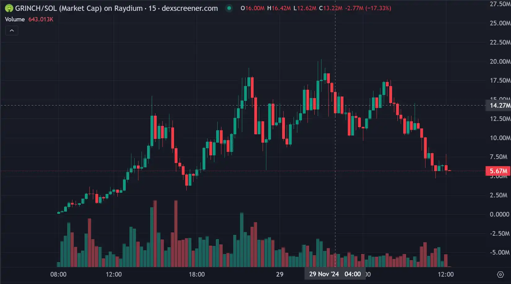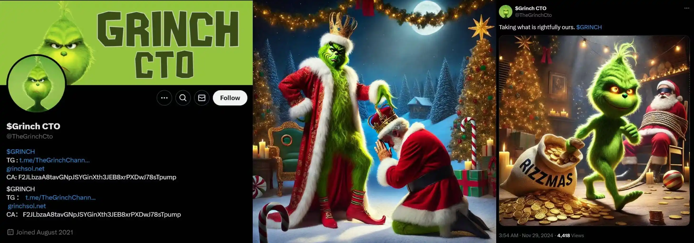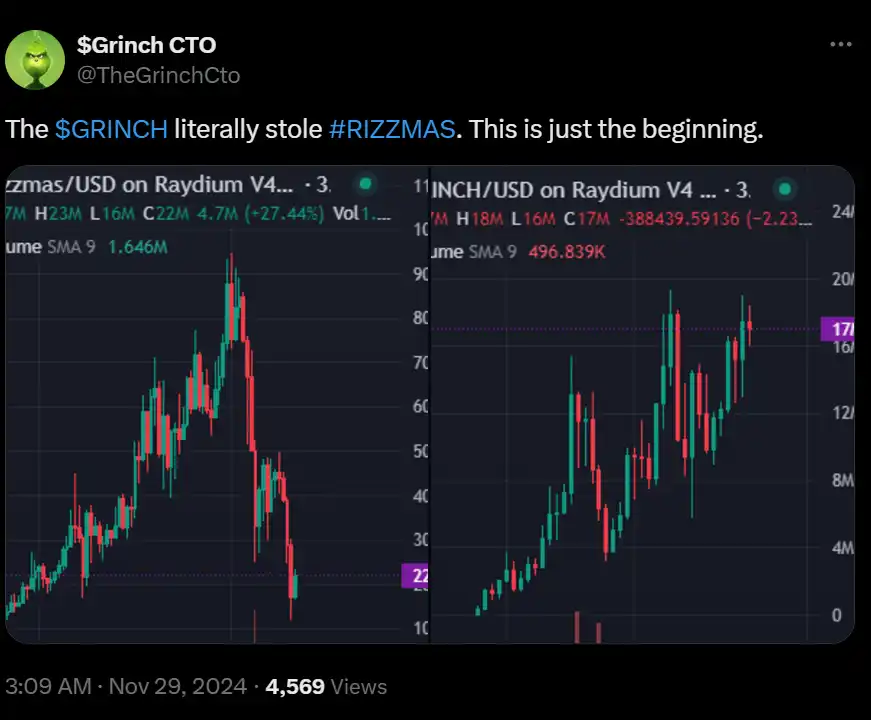 GRINCH 也是圣诞主题**,主打的理念是来带走 RIZZMAS,两个**相互竞争,在其推特主页也主要是对 RIZZMAS 发起 PK 邀约,GRINCH 蹭着 RIZZMAS 的热度在两天内迅速波动上涨至** 21M 的市值,24h 交易量达到将近 100M 直追 RIZZMAS。