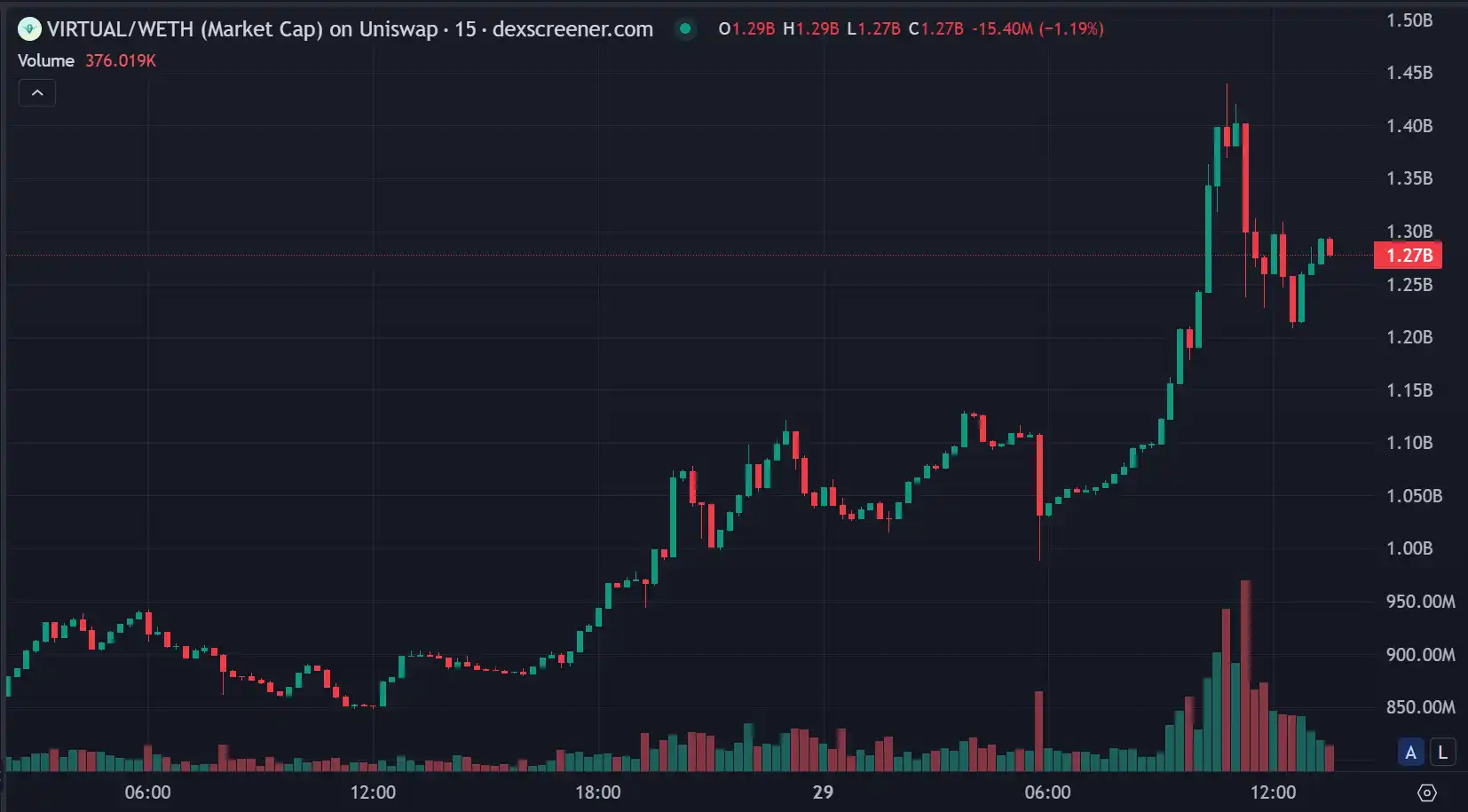 由于最近 AI 代理热度的不断上涨,virtual 上的 AI 代理**的价格都在上涨,购买** Virtual 的数量也是必然会跟随着上涨,近三日市值将近翻两倍。