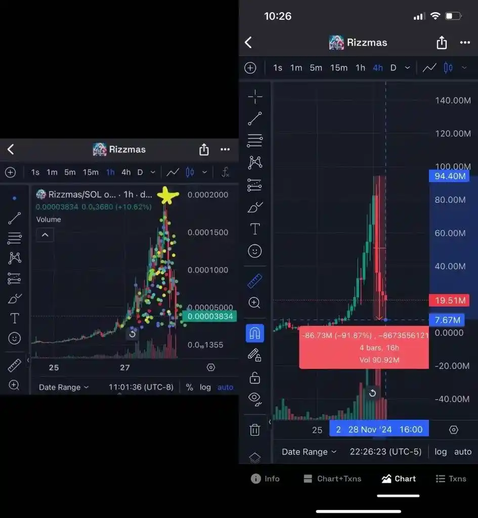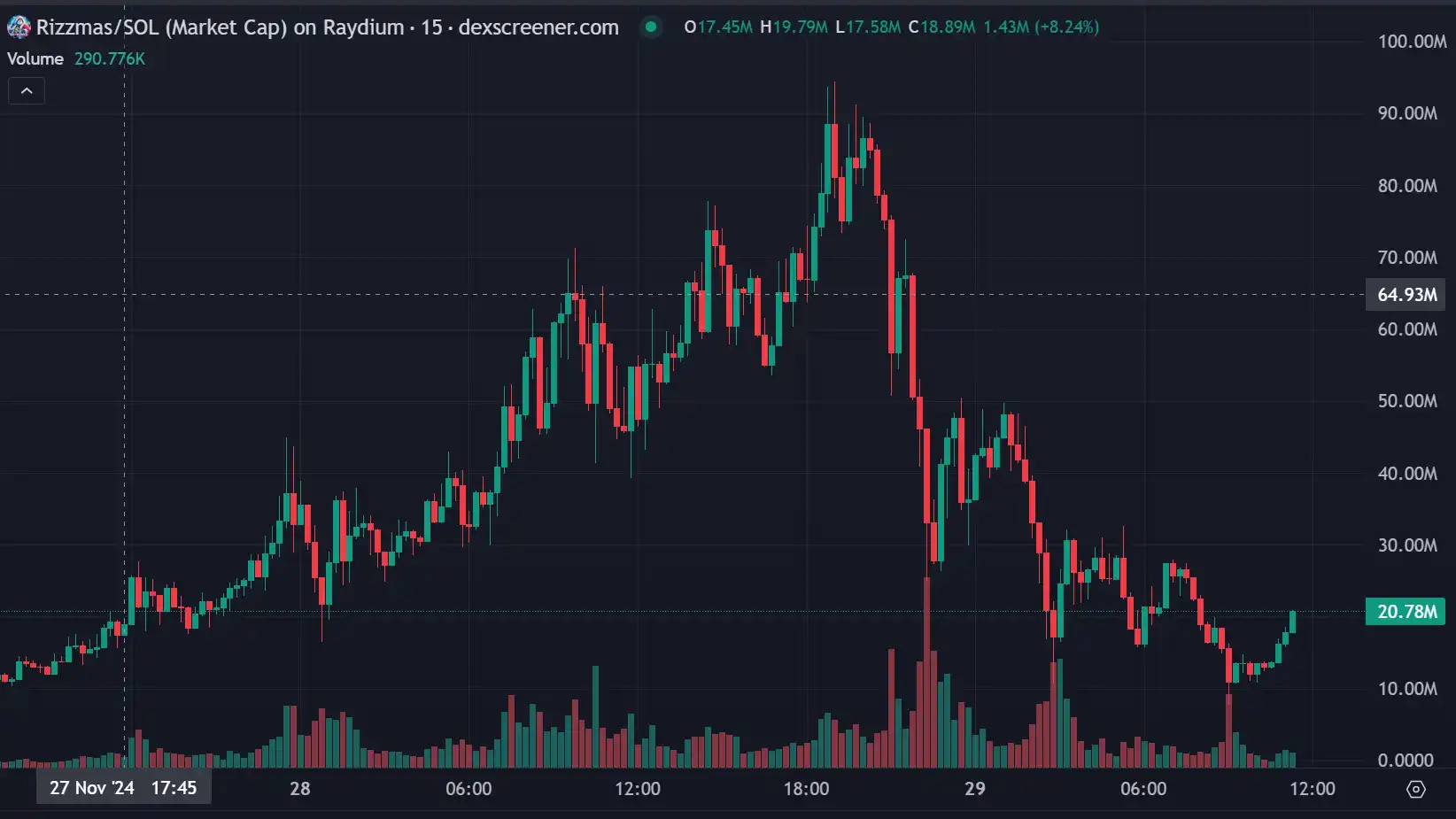 有趣的是随着价格回调,很多 CryptoTokkers(TikTok 网红和用户)在他们的中都声称当 Rizzmas 波动导致市值达到 10 万美元时就要停手。尽管价格回调了一波,但 RIZZMAS 又展现出极强的反弹势头,也有 Tokkers 认为这是 Rizzmas 在为下一轮上涨做准备,尤其是在圣诞节临近之际。