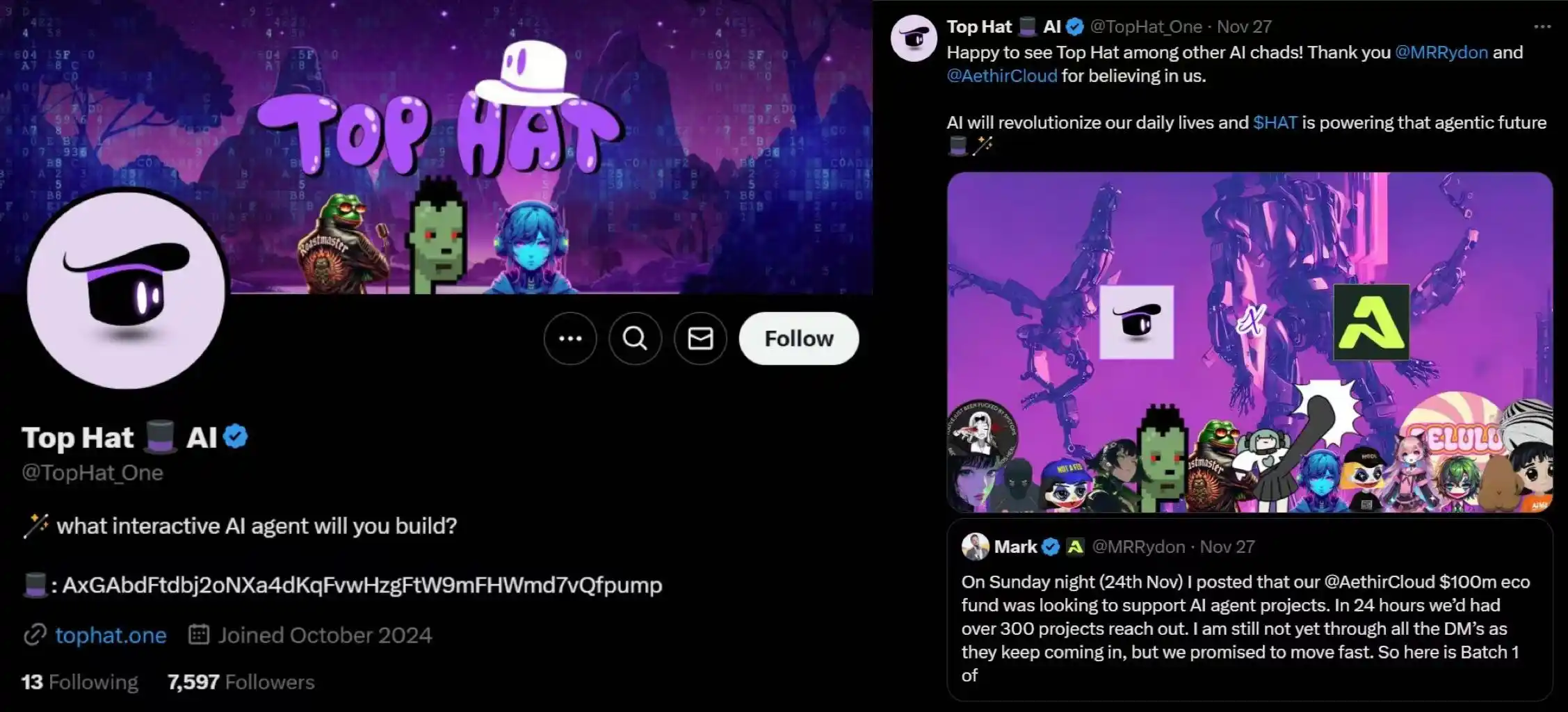 Top Hat 是一个 Solana 链上支持创建和管理 AI 代理的平台,Top Hat 也有自己的平台** Hat,该平台允许用户创建 AI 代理 (类似 Virtual)。这些代理不仅可以与用户进行文字交流,还能理解和处理图像内容。比如当你给它们发一张图片,它们能「看懂」图片的内容,并做出合适的回应。