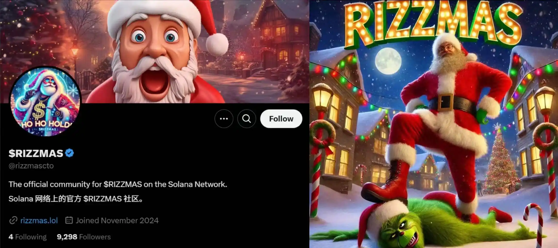 Rizzmas 是圣诞主题的**,圣诞节是 12 月 25 日,网友们希望 Rizzmas 在圣诞节前达到 1 亿市值。在 28 号 Rizzmas24 小时内迅速上涨市值接近 1 亿美元,目前已有超过 14 万个钱包地址,其中有超过 2 万个是新流入的地址,24 小时内的真实买单量超过 22 万,Rizzmas 作为 TikTok 相关的炒作型**可见 TikTok 的引流效果相当强劲,这也是狠狠给老项目上了一课。
