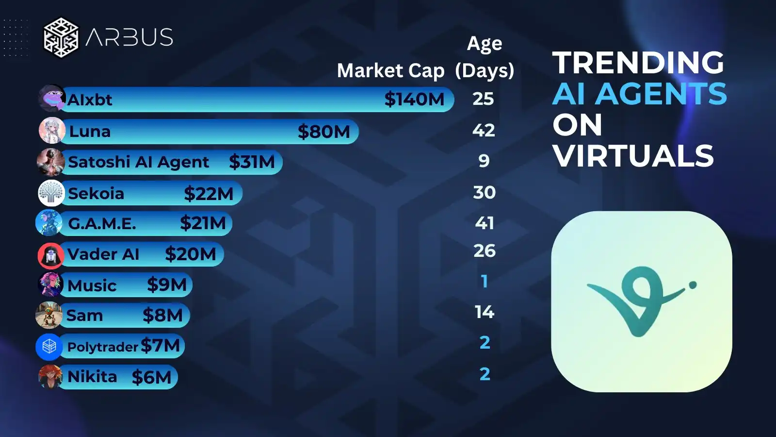 Virtuals Protocol 的平台币 VIRTUAL 已经突破 10 亿市值并且还在不断的突破新高。同时,Virtual 还在不断增强产品矩阵,Virtual 已经有了如 luna、aixbt 和 sekoia 等十多个具有**规模的 Ai agent,并且数量还在增加。