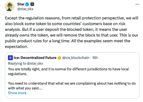 1月23日财经报道,OKX**执行官Star在社交媒体回应ICE项目方表示,除了出于监管原因外,从保护散户的角度考虑,OKX还会根据风险分析阻止向某些**的客户提供某些**。但如果用户存入被限制交易的**,这意味着用户已经拥有该**,平台将解除对该用户的限制。这一规则已经在 OKX 的规定中存在了很长时间。