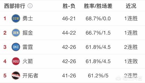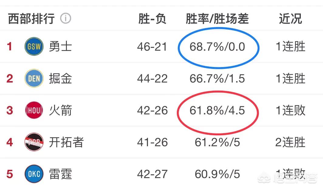 但是我们可以期待一下火箭**进入西部前三,甚至是前二。比如,今天掘金和雷霆都有比赛,如果两队都输球,那么火箭会再次反超雷霆,成为西部第三,同时和掘金队的差距只剩2.5个胜场差,那么追上这个差距还是能够期待一下的,毕竟论状态,近期的火箭队是比雷霆和掘金要好一些的,但是以勇士的实力和状态来看,火箭反超的可能很小。