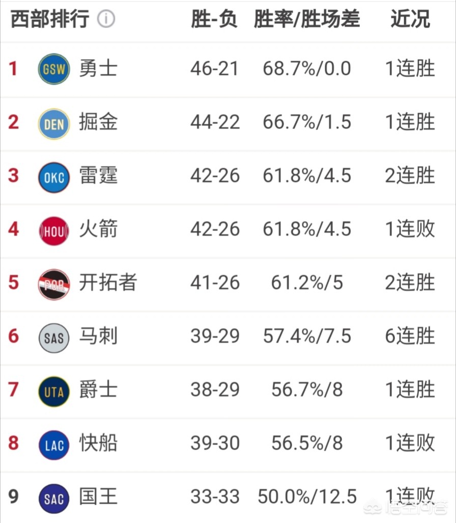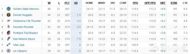从目前排名以及战绩看,西部季后赛8支球队已经八九不离十了,其中分为三档,1-2名勇士和掘金,3-5名火箭、雷霆、开拓者,6-8名马刺、爵士和快船!