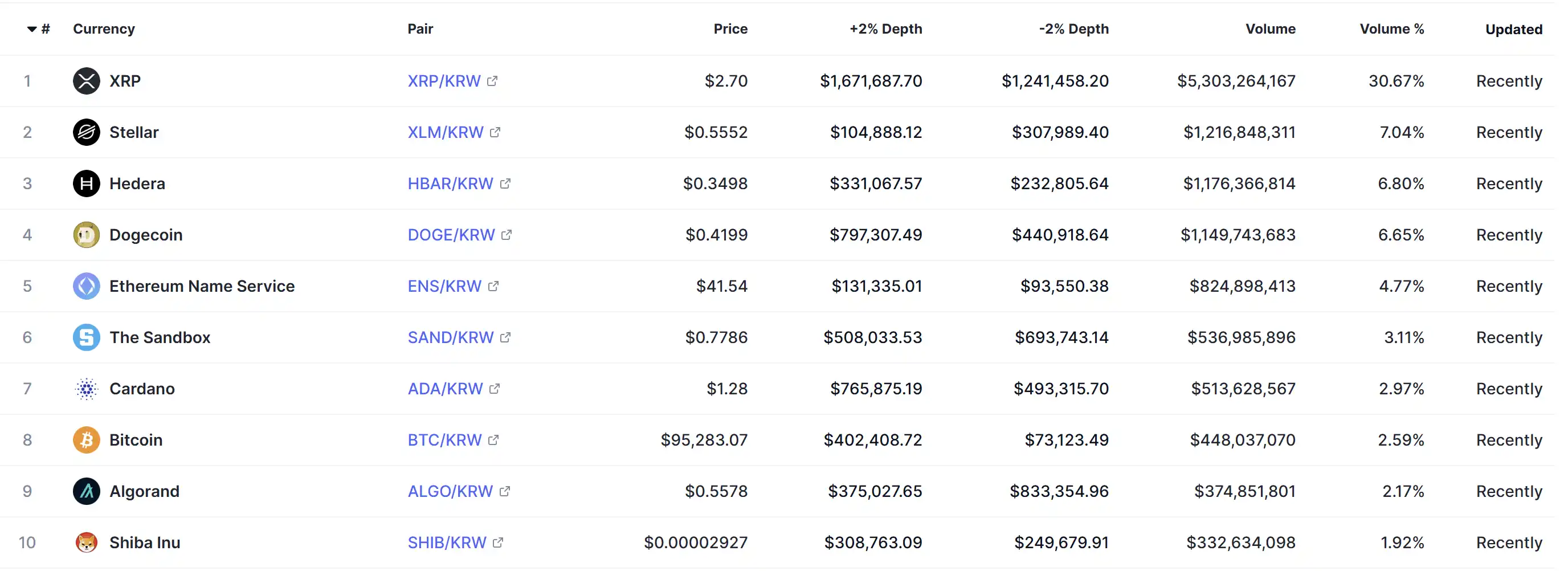 下面是韩所 Upbit 的成交量列表,你会发现 BTC 在这个排行里只能算「弟弟」。XRP 的成交量是 BTC 的 10 多倍,XLM(Stellar)和 HBAR(Hedera)这种在华语圈鲜有身影的项目也在榜上「赫赫有名」。