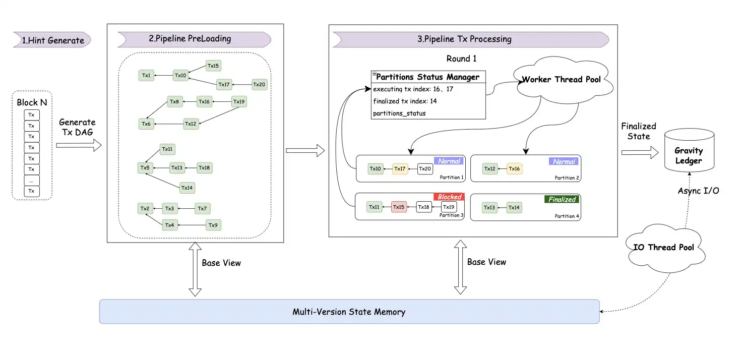 · 阶段 3:冲突解决下的并行执行——使用基于依赖 DAG 的修改版 BlockSTM 算法并行执行交易。调度程 序不再严格按照区块中交易的序列号(如 1, 2, 3, ..., n)选择交易,而是优先根据 DAG 排序交易,以** 化冲突并减少重新执行需求。