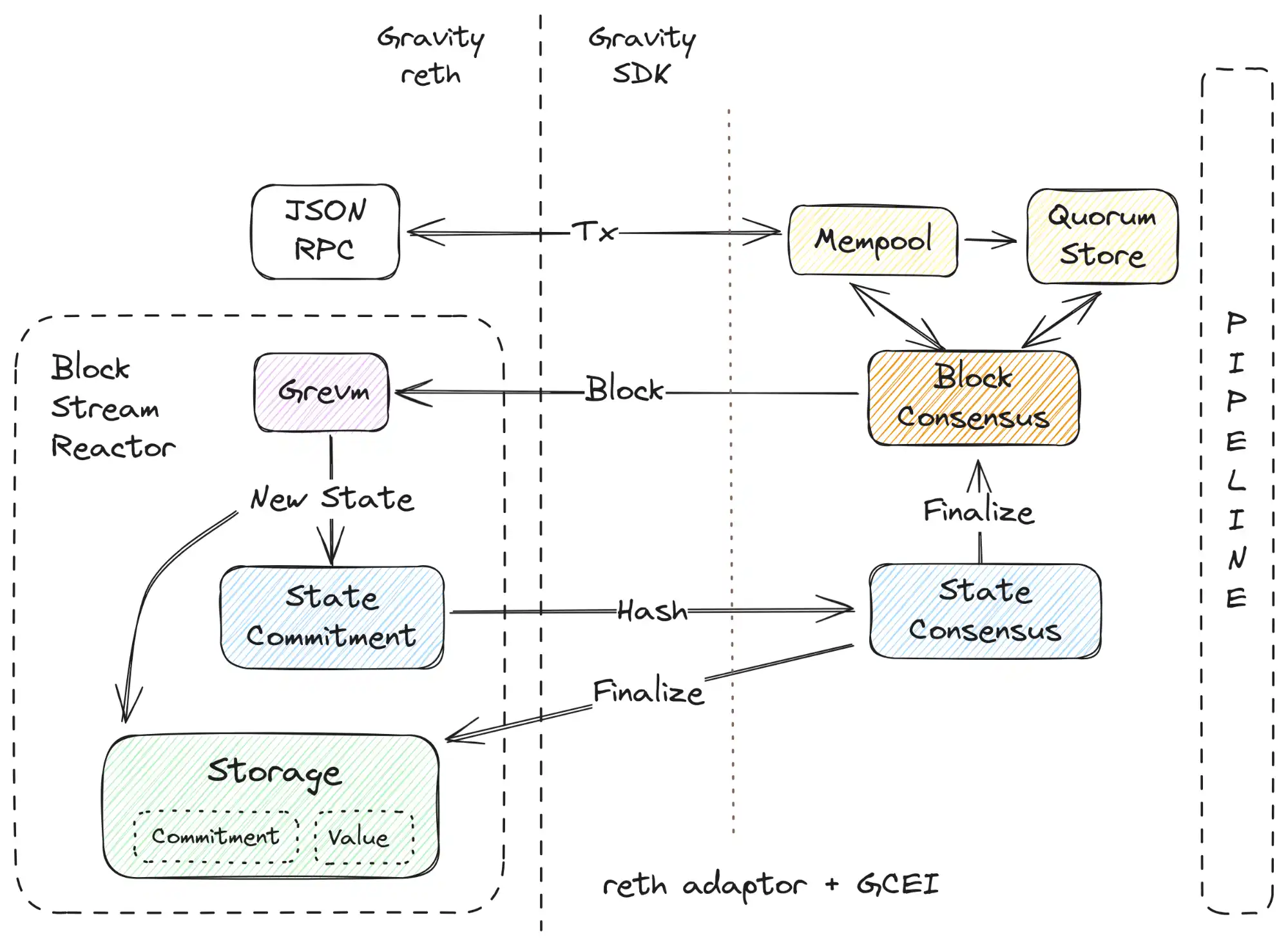 GCEI(Gravity Consensus Execution Interface)协议是共识层与执行层之间的通信桥梁。它规范了两层之间的 交互,确保通过流水线控制器使共识与执行流程保持同步。