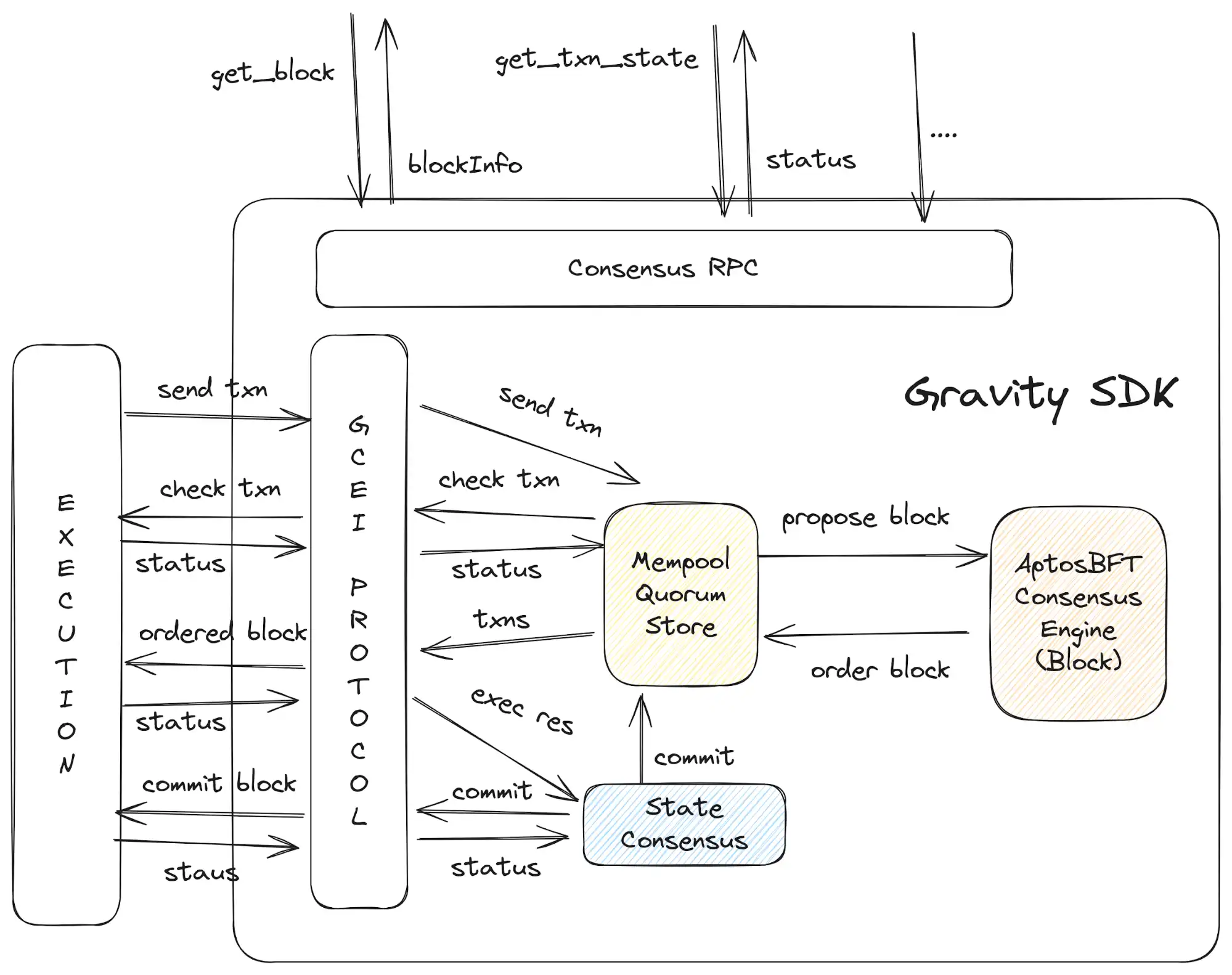 · 共识层 API:这些 API 由 Gravity SDK 实现,用于执行层响应共识引擎提议的区块并提交状态承诺。