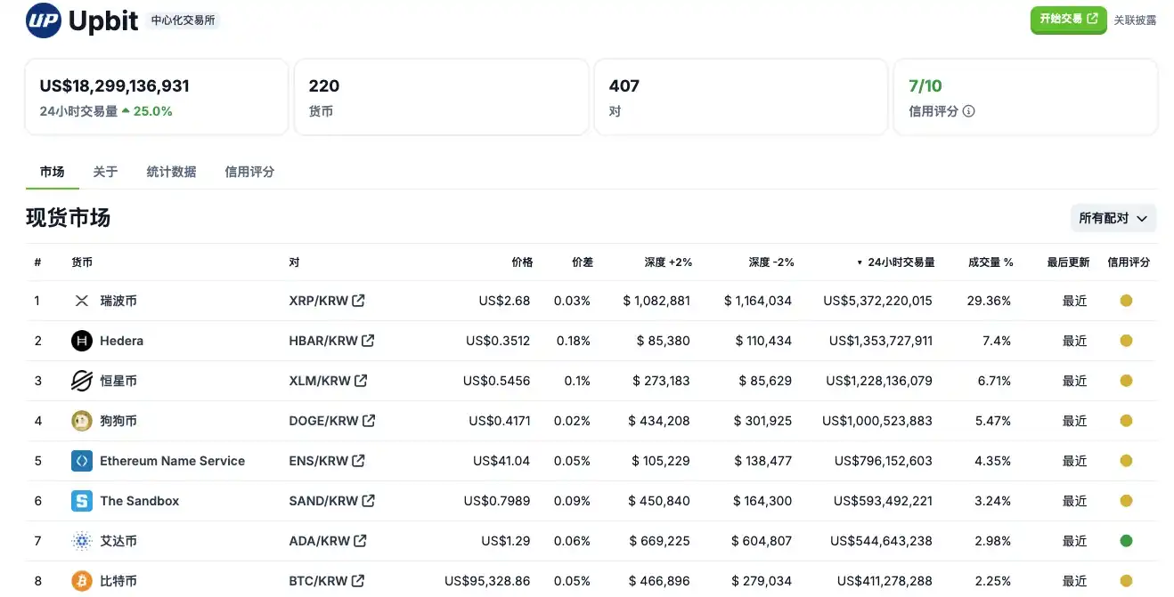 从交易量来看,HBAR 也正在被韩国市场 FOMO。根据 CoinGecko 数据,在韩国**交易所 Upbit 上,24 H 交易量**的是 XRP,交易额超 53.72 亿美元;其次便是 HBAR,24 H 交易额超 13.53 亿美元,是 BTC 成交额的 3 倍。同时与比币安相比,HBAR 在币安 24 H 的交易量超 12.89 亿美元,不如 Upbit。