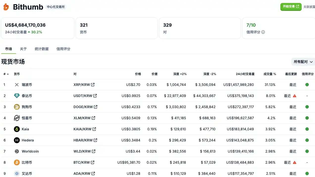 同时,在另一个韩国交易所 Bithumb 上 HBAR 的 24 H 交易量达到了 14.3 亿美元,不仅超过本平台 BTC 的交易量,甚至比 Upbit 上 HBAR 的 24 H 交易量还要高。