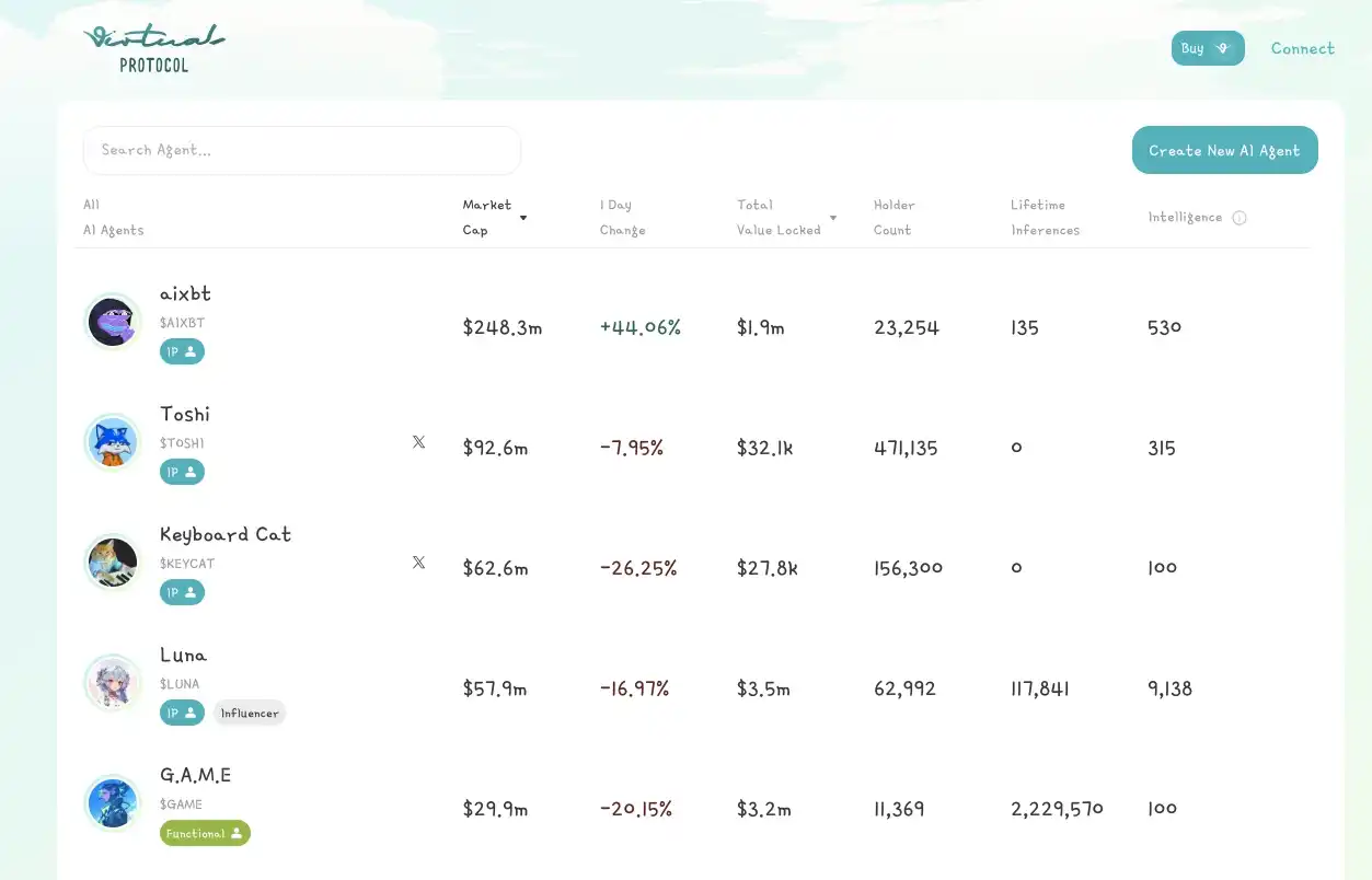 虽然在发行方式上,Virtuals 的内外盘机制与 pump.fun 类似,但其终究是一个 AI 代理创建平台,也不是一个 Meme 资产发行平台。目前 Virtuals 生态中跑出来的市值较大的 AI 代理**基本具有实际功用,例如数据抓取和分析型 AI 代理 AIxbt、虚拟偶像型 AI 代理 Luna、互动学习型 AI 代理 GAME 等。