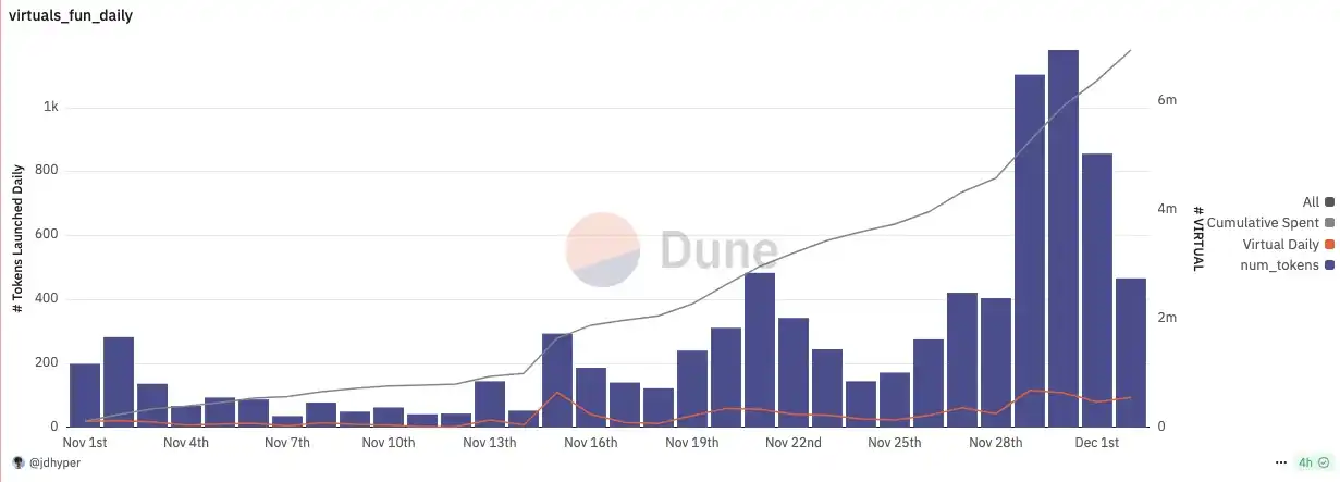 财富效应势必会吸引项目方和链上淘金者——根据 Dune 数据,在 Virtuals 平台推出的 AI 代理**超 8779 个,自 11 月 29 日起,每日创建的 AI 代理**数量激增,约为过去的两倍。