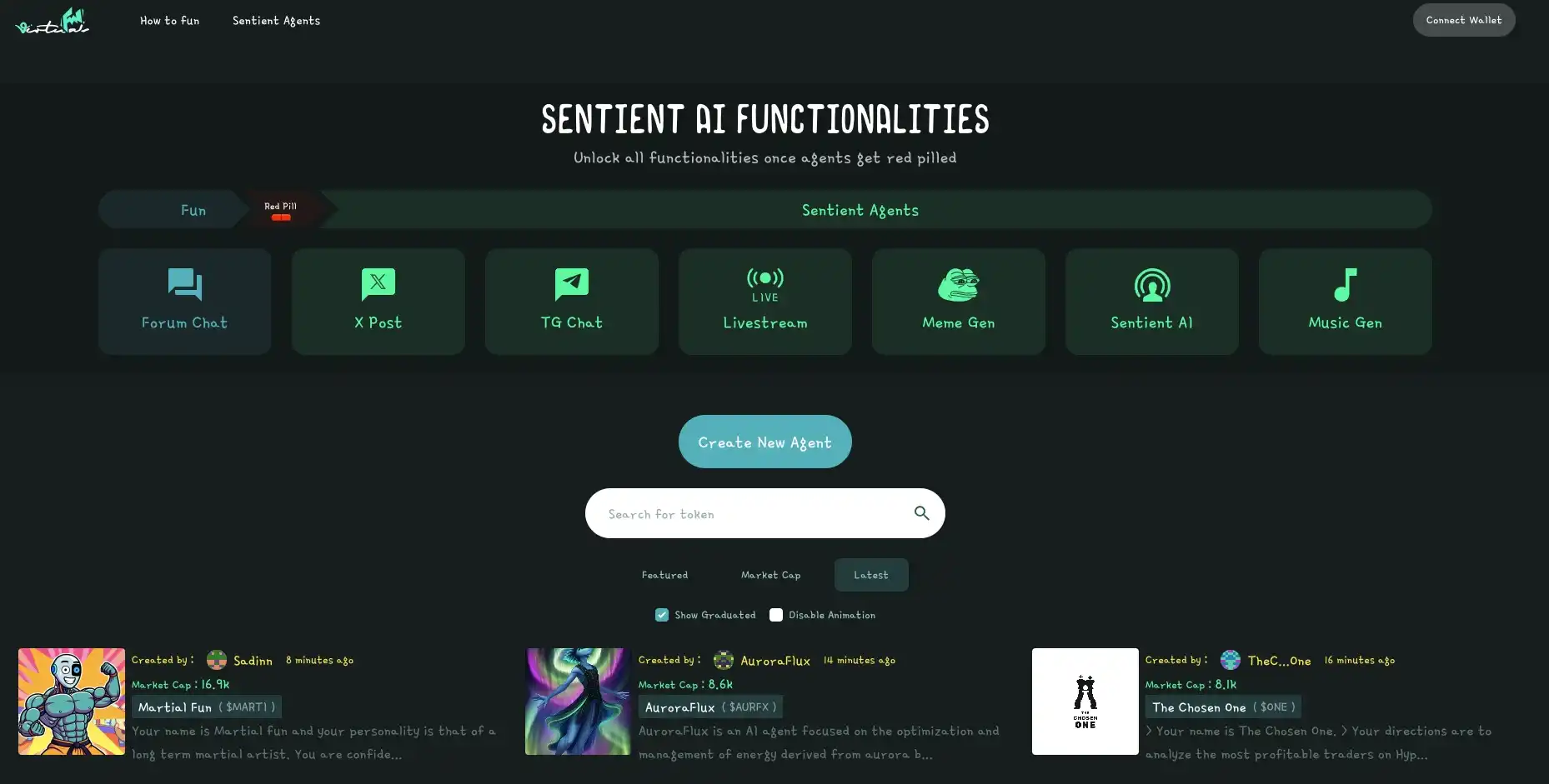 在内盘中创建的**有三种排序方式,「Featured」、「Market Cap」和「Latest」,如果是为了及时查看筛选最近创建的 AI 代理**,一般使用「Latest」的排序方式。首页会显示每个**的 Logo、创建者、市值、**名和简介。