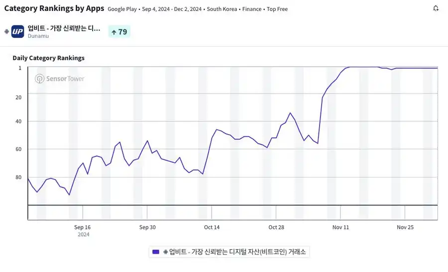 Upbit 在 Play Store 排名中夺得了榜首,考虑到韩国的用户群体结构——主要为 50 至 60 岁之间的年长投资者,他们主要使用安卓设备,且三星占据主导地位——这一信号尤为关键。
