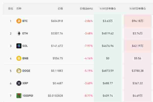 今天早盘,虚拟币市场**崩跌,大多数币种都处于亏损状态。根据CoinGecko的数据,全球加密货币市值目前约为2.35万亿美元,与前一天相比下降了3.5%。据CryptoPotato 数据,比特币 (BTC) 的价格回撤至60000美元大关,而以太坊 (ETH) 则跌至约3300美元。与此同时,最近24小时,共有 112,480 人被爆仓 ,爆仓总金额为 $3.09 亿。