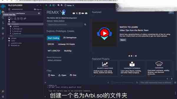 4. 在左上角找到 contracts 选项,创建一个名为 arbi.sol 的文件夹,把测试代码布置粘贴到 remix 中,点击 ok。