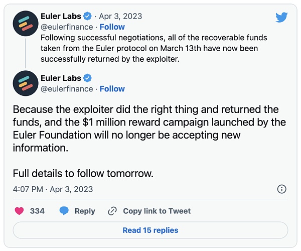 攻击事件发生两周后,攻击者退还了一大笔资金,将价值超过8500万美元的55,000 ETH转回给了该协议。虽然目前尚不清楚其与Euler达成的具体协议条款,但看起来受影响的用户们将会得到部分或**的赔偿。