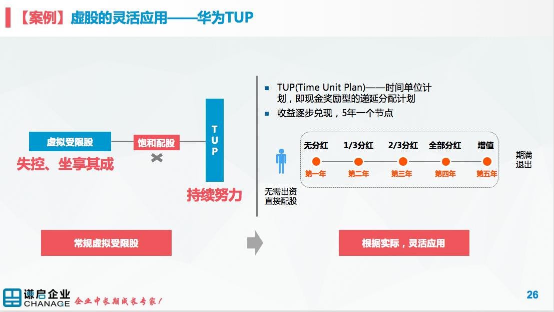 为了解决拉车的人和坐车的人的分配公平性问题,华为对激励方式做出了调整:从2015年起引入TUP(时间单位计划),每期计划周期为5年,前4年递增分红权收益,**一年除了获得全额分红收益之外,还可获得5年中股本的增值收益,5年期满后所有人员退出开启下一轮计划。从中长期看,随着TUP实施范围和力度的逐渐增加,原虚拟受限股收益占总收益的比重就会逐渐下降,在**程度上保证了只有长期奋斗的人才(既包括**新员工也包括**的老员工)才能持续获益。