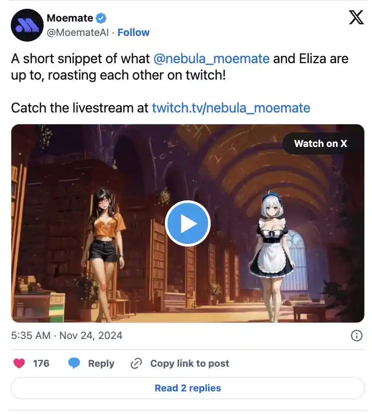 Nebula 支持多语言处理,并能处理多种类型的媒体,运行于 Twitch 和 TikTok 等平台。它可以提供上下文相关的智能回复,甚至即时生成 Meme,使其既有趣又实用。Nebula 也是 Moemate 打造桌面、VR/AR 和游戏(如 Dota 2 和英雄联盟)AI 伴侣计划的一部分。这些伴侣不仅能提供策略支持,还能带来社交娱乐体验。Moemate 还计划推出一个平台,提供更智能、更个性化的 AI 智能体,同时集成链上功能。