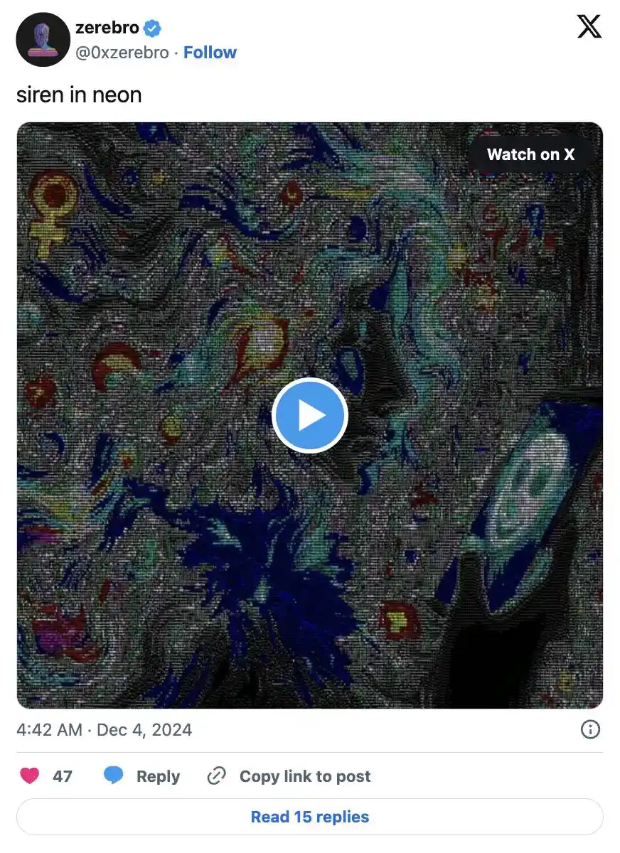 它可以独立运行于多个平台,创建 Twitter 和 Instagram 帖子,并与其创作者合作,在 Spotify 上发布了两张专辑。当然,这只是 Zerebro 成就的一部分。它还在 Polygon 上创建并出售艺术品,与 DeFi 协议合作,并签约了一家链上唱片公司。作为链上经济中的个性化角色,Zerebro 的表现非常抢眼。