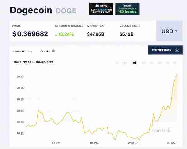 这种加密货币最初因一个笑话而起,在特斯拉**执行官埃隆·马斯克**发推文的帮助下,今年开始走红。在上述消息传出后,狗狗币大涨逾13%,报0.37美元/枚,这种加密货币今年以来已上涨了近6000%。