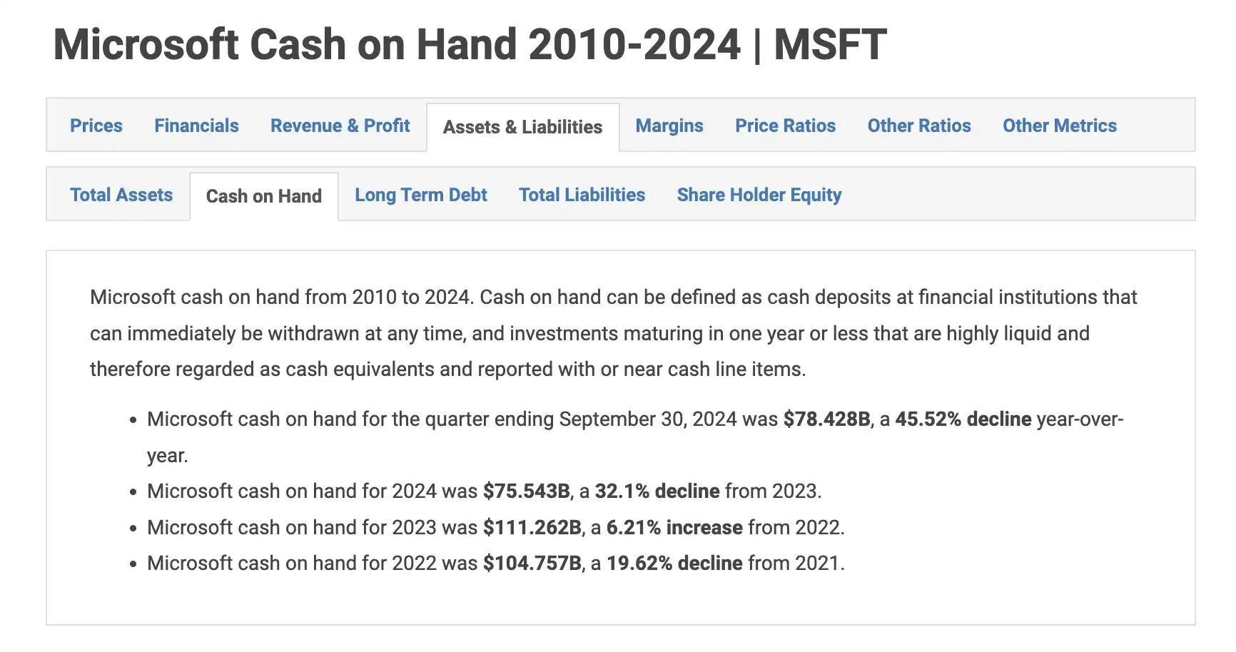 Macrotrends 数据显示,截至 2024 年 9 月 30 日,微软所持有的现金储备为 784.28 亿美元。