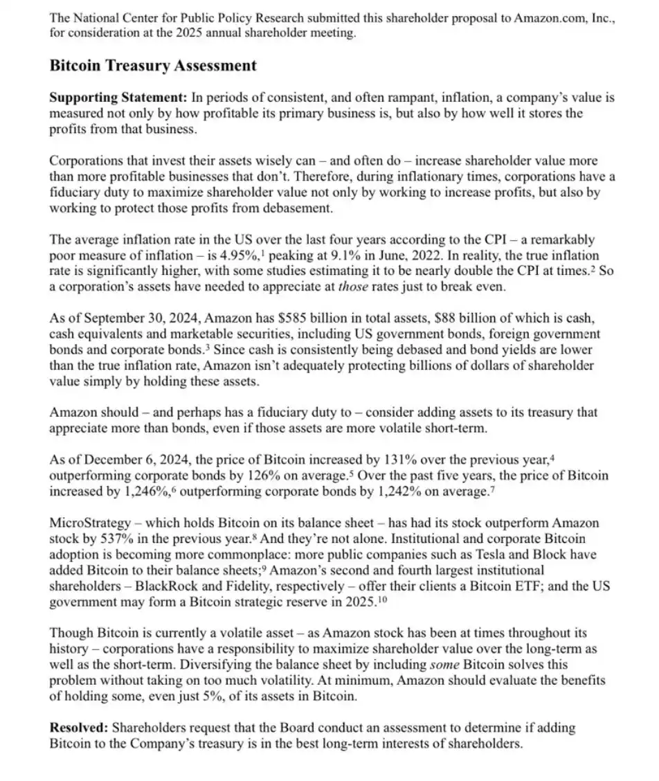 今日早间,NCPPR 再次向另一大科技巨头亚马逊提交了类似的股东提案,建议亚马逊评估将比特币纳入公司的资产储备。这一次,NCPPR 建议亚马逊至少投入总资产的 5% 。