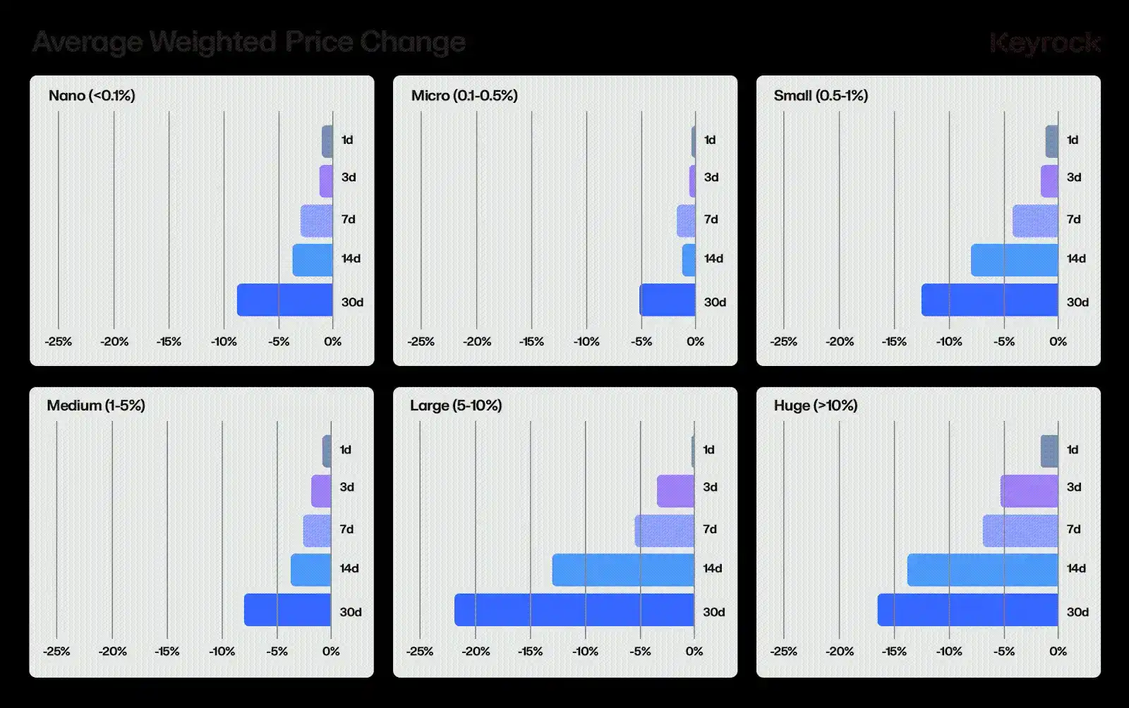有趣的是,数据显示,巨额解锁(> 10% 的供应量)的表现与大型解锁(5%–10%)一样好甚至更好。这可能是因为由于解锁规模太大而无法**对冲,并且无法在 30 天内抛售或解除。因此,它们的市场效应往往更加渐进和**。