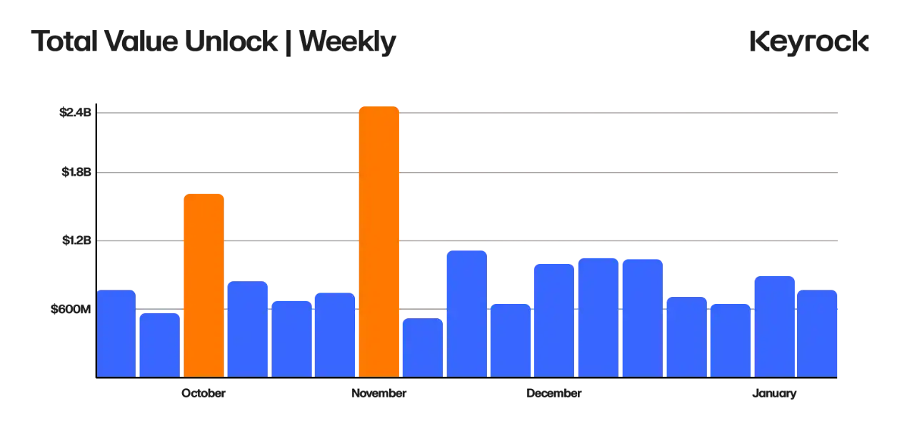 每周价值超过 6 亿美元的锁定**解锁(相当于 Curve 市值)。这些**通常在预定的时间间隔内被释放,流入不同参与者的手中。这些解锁的规模和间隔,预期和日期,还有获得这些**的人,都对**价值和市场产生影响。
