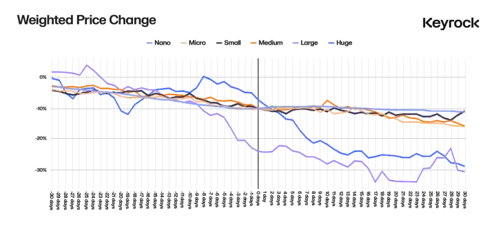 本文首先分解了 16,000 个复合事件的归属期,并按大小对每个事件进行分类。对于每个事件,都跟踪了解锁前 30 天和解锁后 30 天的每日**价格。此外跟踪了每个** 30 天预解锁期前一个月的「中位数」价格和波动率指标。这一点至关重要,因为许多项目都采用每月解锁计划。这种方法并不**,但可以更好地隔离较小规模的解锁。