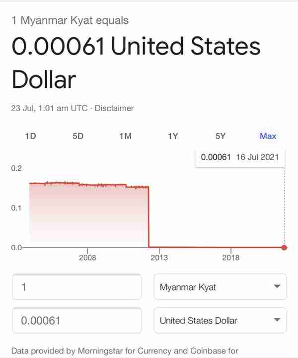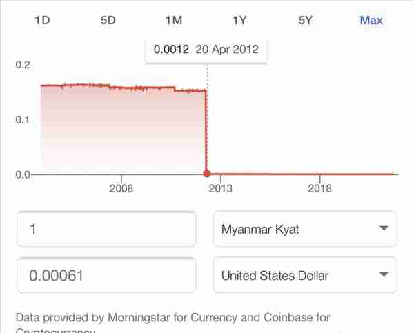 感受一下缅甸Kyat兑美元这么多年的走势。2012年之前缅甸有个**标准汇率。那个政策就是个**笑话,有兴趣的小伙伴可以自行搜索。总之,由于**政局不稳定等各种因素,货币一年比一年不值钱。从12年至今,本人坐标新加坡,本地女佣市场的工资涨幅在25%左右。但是他们本国货币却已贬值50%