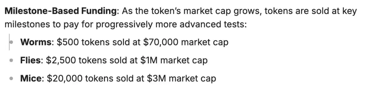 当该方案在真实线虫上进行测试时,就可以观看实验数据流。数据定期传输给用户,供用户评估干预措施的价值。当然,更进一步,之后还会对果蝇、小鼠身上进行测试,收集更昂贵、更耗时但更与人类相关的数据。相关干预措施在获得许可后,可以作为补充剂或研究化学品出售。当然,随着**市值的增长,**会在关键里程碑处(7 万美元市值、100 万美元市值和 300 万美元市值时)出售,以支付逐步更**的测试费用。