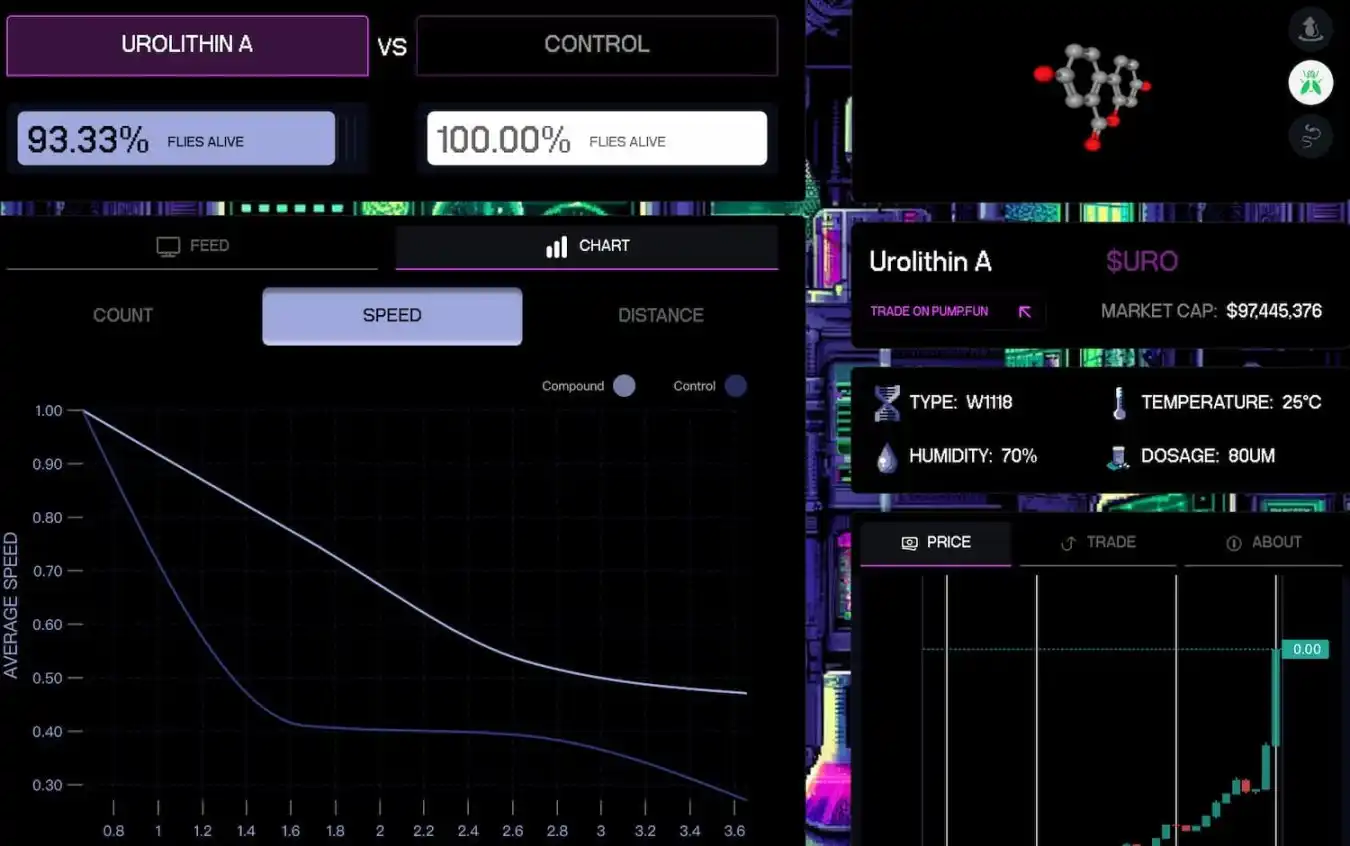 当前在 pump.science 上**两项实验,利福平 Rifampicin(RIF)和尿石素 A Urolithin A(URO),且均处于果蝇测试阶段,市值分别为 1.9 亿美元和 9700 万美元。两项实验的完成进度均为 2.74%。