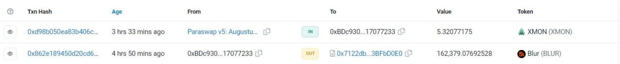 简单分析来看,SUDO初始流动性不太可能在3月初之前部署(也就是说3月前SUDO不太可能在交易所上线),这也是现阶段不少交易者把目光投向BLUR的原因。不过下一波加密市场注意力很可能会转移到SUDO上,链上数据显示已经有人开始探索SUDO的潜力,比如下图中的巨鲸已将162,379枚BLUR**兑换成了XMON。