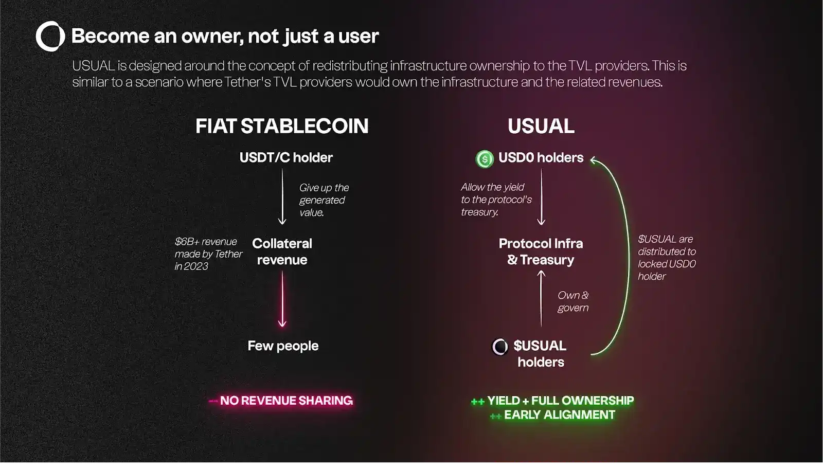 而右侧则是 Usual 的运行逻辑,其核心理念是 Become An Owner, Not Just A User.(成为所有者,而不仅仅是用户。)项目的设计也围绕这此理念进行,将基础设施所有权重新分配给总锁仓价值(TVL)提供者,也就是用户的法币都将转换为超短期美国国债的 RWA,整个实现过程则通过 USYC 进行(USYC 由 Hashnote 运营,该公司目前是较为前列的链上机构资产管理公司,由 DRW 的合伙人支持),**收益进入协议的金库,并由协议**持有者拥有并治理。