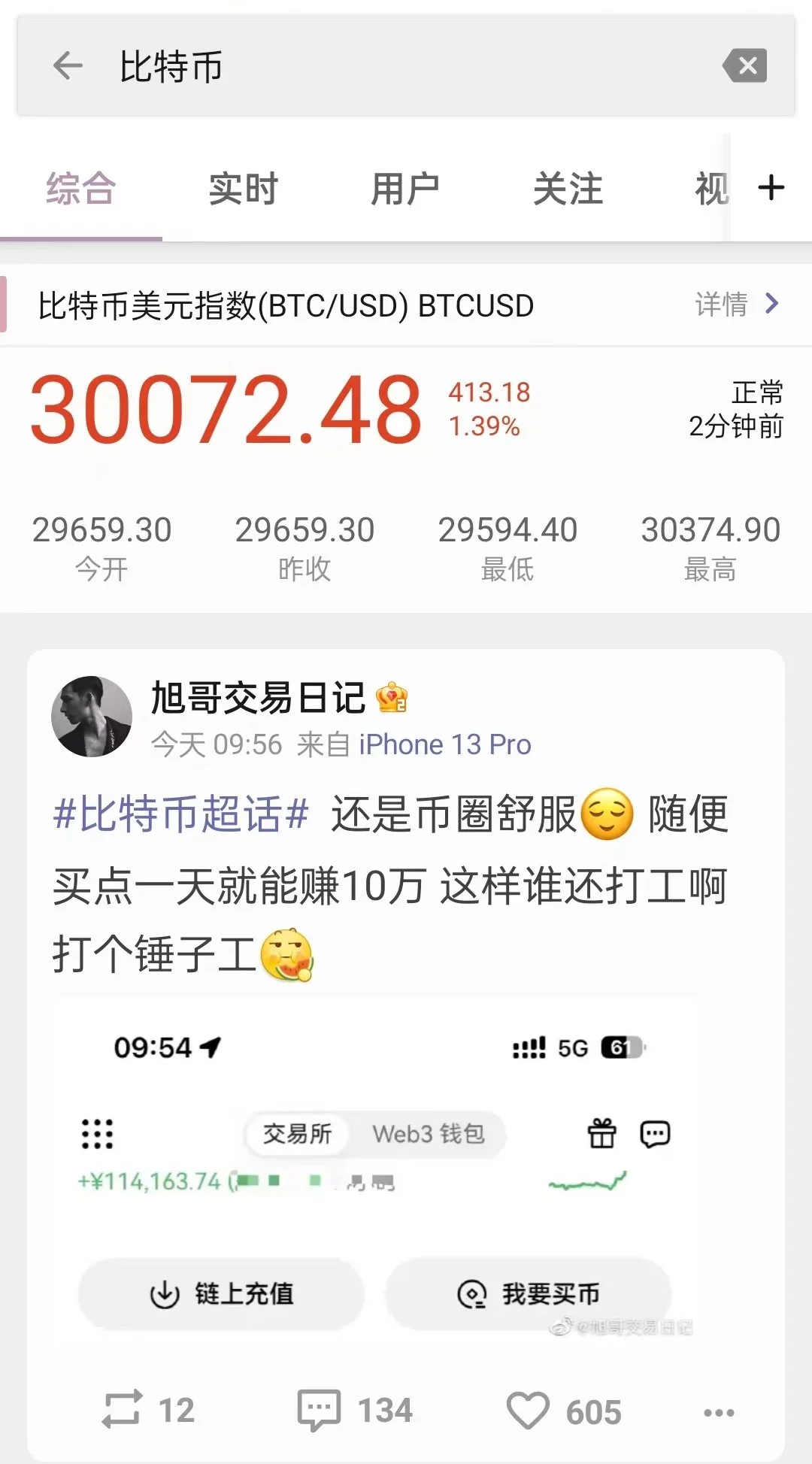 抖音微博显示比特币价格_比特币BTC重回3万美元