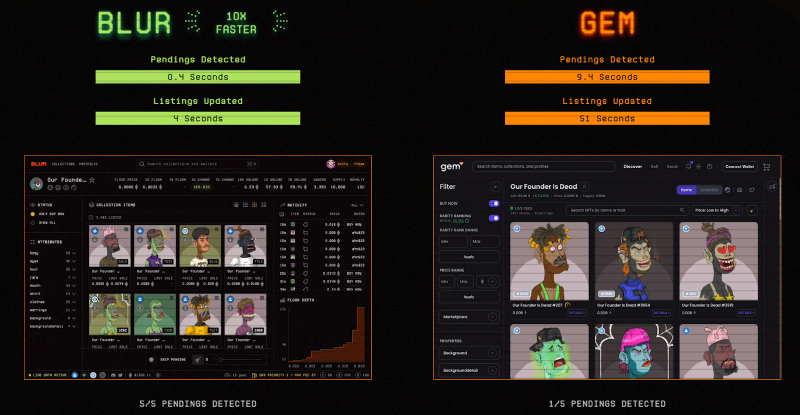 此外,Blur 的列表刷新速度很快,通过实时列表和即时 NFT 元数据显示,使自己在竞争中脱颖而出。据 Blur 称,它的市场比 Gem 快 10 倍,Gas 效率高出近 20%,Gem 是 OpenSea 为资深交易员提供的 NFT 聚合器。