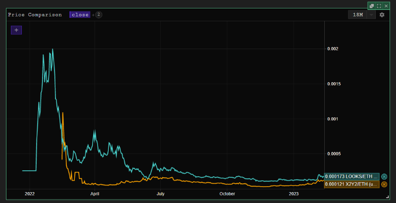 以 NFT 市场 LoGate.iosRare 和 X2Y2 为例,它们都在去年年初推出了 LOOKS 和 X2Y2 **激励措施。正如你在下面的价格比较图中所看到的,这两种**在最初推出的时候都很兴奋,此后价格都有很大下降。随着时间的推移,这两种**都未能从 OpenSea 手中夺取大量的市场份额。当然,他们的故事仍然在讲述,但显然现在他们已经不像以前那样令人兴奋或诱人了。