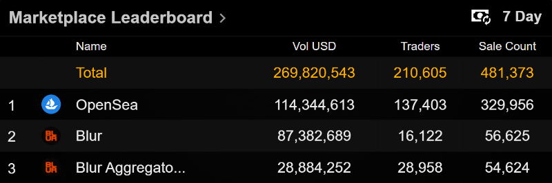 OpenSea 目前与之平行的地方是 NFT 交易量水平,Blur 数周以来一直与现任巨头(OpenSea)并驾齐驱。