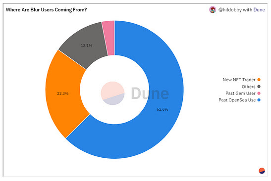也就是说,Blur 的早期用户中有 65%来自 OpenSea 和 Gem 因此,如果 Blur 能够稳固其护城河,那么这些用户可能会**转向。