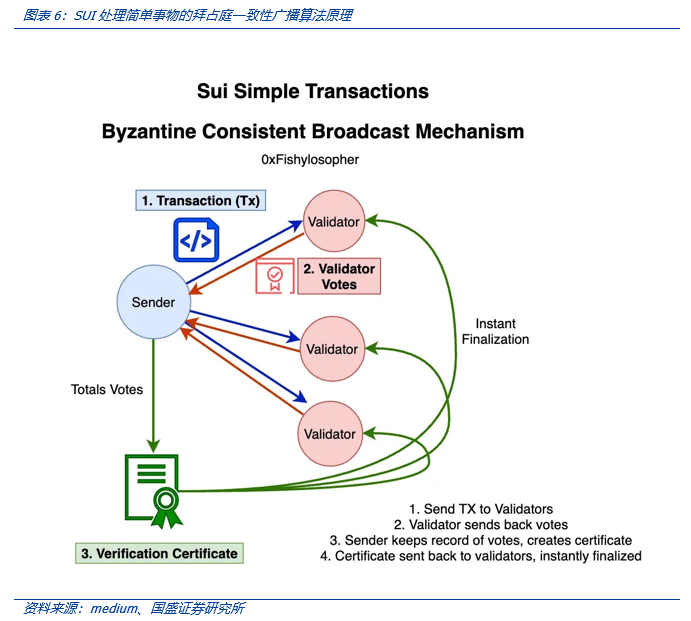 为识别简单事物交易,SUI使用基于拜占庭一致性广播算法(Byzantine Consistent Broadcast)。这种简单算法是的SUI在处理非关联的简单交易时,只对相关数据而不是整个链进行锁定(或“停止区块链世界”,如以太坊出块延迟那样),或者简单理解为对这类非关联简单交易事务脱离交易排序进行特别处理——即识别单一作者应用程序( Sui Single-Writer-Friendly (SWF) Apps),官方文档列有24类简单事务的示例列表(如简单的P2P2交易、公共信息公告),这些单一作者事务可以使用该算法进简单快速处理。
