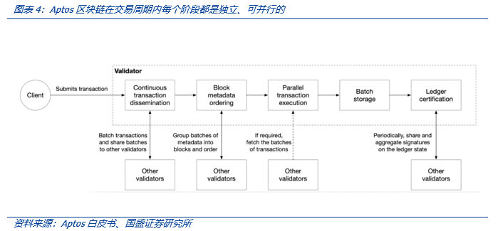 3共识协议与交易处理我们所熟悉的区块链如以太坊,通常作为一个去**化的状态共享机器,随着时间的推移,系统用户状态以区块的方式累加——即**的串行交易排序。我们在本系列的前两篇报告层对Move语言并行处理进行过分析,以Aptos、SUI为代表的Move系基础链都有各自的并行处理模式,这依赖新的共识协议——由于Move语言的特点,Aptos的共识协议与交易执行解耦的模式,以及SUI的单一编写者和异步共识协议都为区块链交易的共识提供了更多的灵活性——前者将交易执行流程细分进行独立、批量处理,而后者则充分考虑到验证节点的算力负担,试图将一些简单交易从验证节点解放出来。
