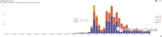 在整个2022年,NFT艺术品的交易量急剧下滑。这种下滑程度**也激烈于PFP为主的Opensea等NFT交易所。SuperRare/Foundation/AsyncArt/KnownOrigin/Marketplace,这些玩家我们在22年较少听到他们的声音。