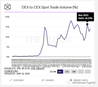 但我们可以看到的数据是,DEX的交易量在FTX**后的几天迅速翻倍,大家对于**化机构的恐慌转变成了对于去**化金融协议的信任,所以,这个行业并不是没有规则,而是在Crypto的世界,只有代码才是规则,代码即法律,我们没有必要相信****化机构,而更应该开源协议和智能合约带给我们的安全感。这是DeFi下一轮的叙事之一,即取代现有的**化金融机构。2020年的时候,因为交易挖矿、流动性挖矿等激励方式,DEX交易量一度占到了CEX交易量的15%,而经过两轮下跌以后,已经不再有足够丰富的挖矿**激励,但我们看到最近DEX的交易量又回升到了15%左右,这是符合新兴技术的发展曲线的,即在泡沫消退后,有越来越多的人开始把DEX作为日常交易的场所,去替代CEX的功能。