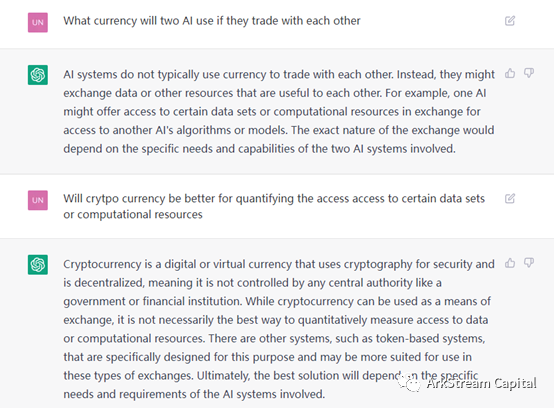 如果AI之间进行交易,它们会用法币还是数字货币来交换?我曾向ChatGPT问了这个问题,他回答我说,用**ate.ion对数据访问的权限进行量化定价是一个相比于传统货币更好的方案。