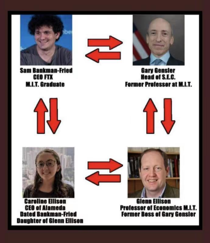 不过,在所有的“人和”中,SBF 和 SEC 主席 Gary Gensler 之间的关系自 FTX 破产后就一直牵动着吃瓜者的神经。简单来说,SBF 和 Gary Gensler 都来自 MIT,一个是在 MIT **,一个是在 MIT 教书。Caroline 是 SBF 的另一家公司 Alameda 的 CEO,她的父亲 Glenn Ellison 是 MIT 经济学院的教授和主任,同时也是 Gary Gensler 在 MIT 期间的直属上司。