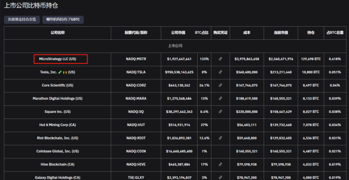 2020 年 7 月,MicroStrategy **购买比特币。据 coinglass 数据显示,MicroStrategy 目前持有 12.96 万枚 BTC,是持有 BTC 最多的上市公司。